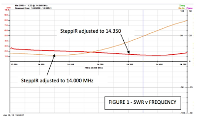 The initial step was to get familiar with the instrument’s many features, which I did by making some measurements on my SteppIR beam in order to document its characteristics for future reference. I ran scans of SWR versus frequency for the SteppIR set to resonate on each of the HF amateur bands (2 curves, one with the antenna set to the low end of the band, and the other to the high end). The resultant graphs showed, as expected, a low SWR on all bands with the minima near the SteppIR operating setpoint. In the interest of space only the 20 m curves are shown in Figure 1, but those for other bands displayed a similar pattern.